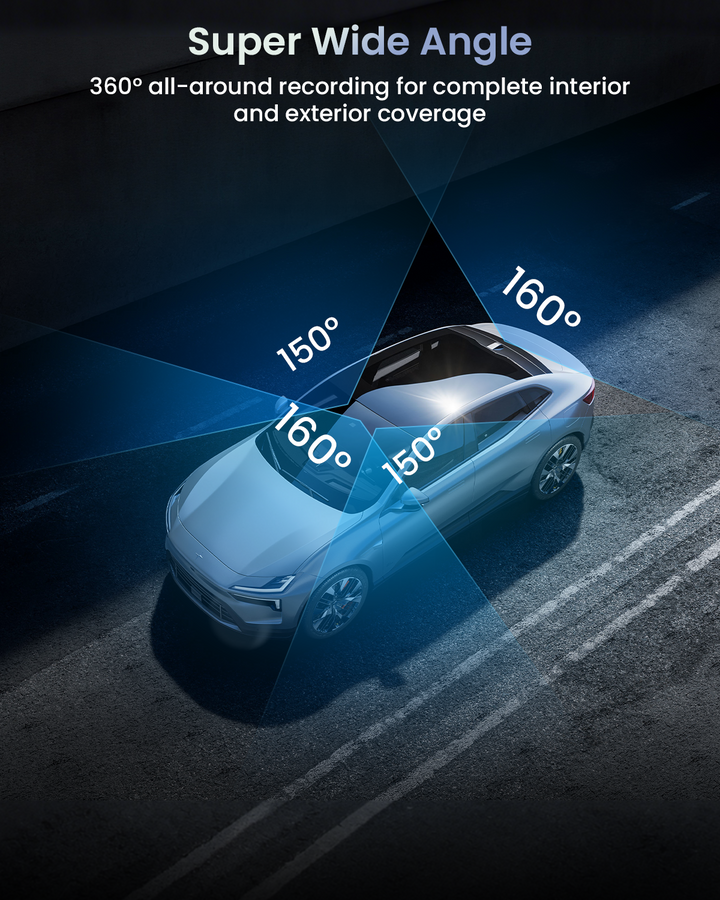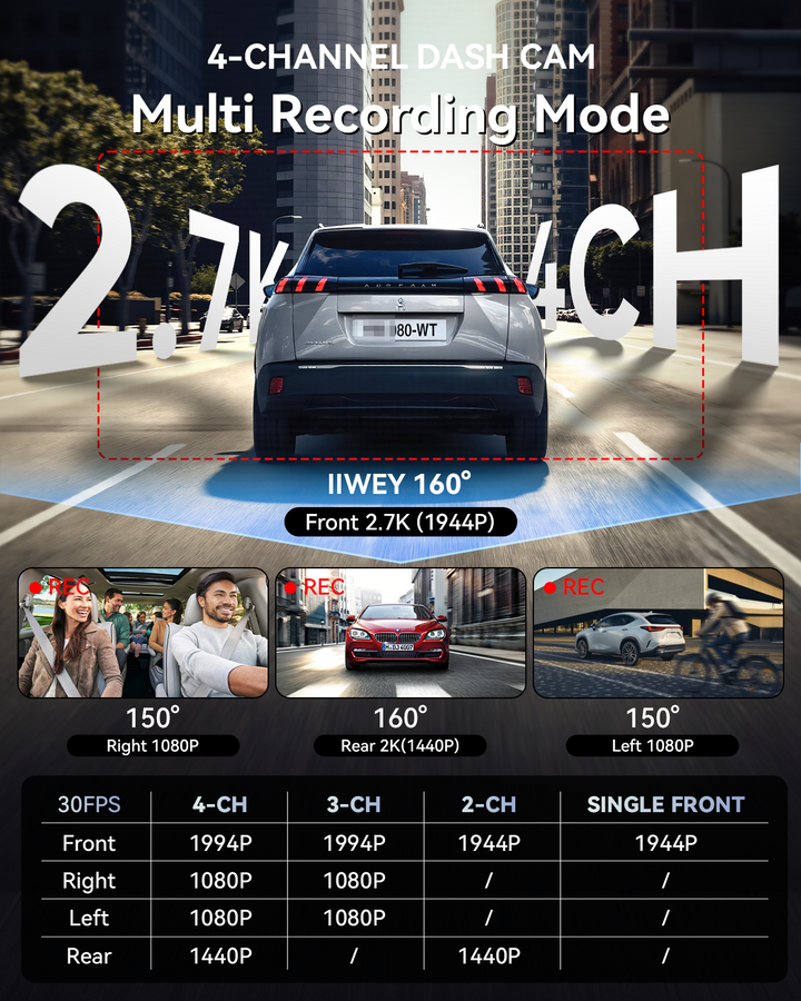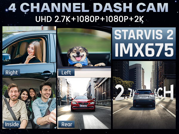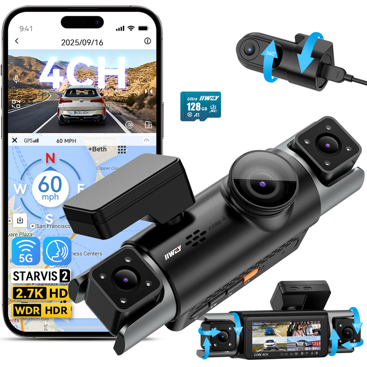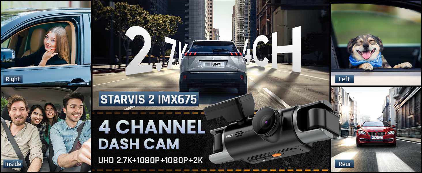 - ⭐【4-Channel Dash Cam with 360° Coverage】 The IIWEY C4 PRO features a front camera with the premium IMX675 sensor, recording sharp 2.7K (1944P) video. The rear camera captures in 2K (1440P), while dual side cameras deliver 1080P, ensuring complete multi-angle coverage. Supports 1/2/3/4CH recording. With 160° front/rear and 150° side lenses, it eliminates blind spots and provides seamless 360° monitoring of every detail around your car.