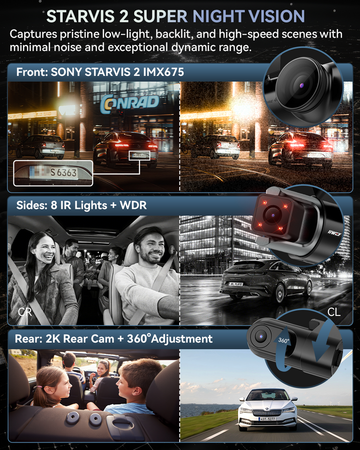 - ⭐【Superior Night Vision – STARVIS 2 & Infrared】 The front camera uses the advanced STARVIS 2 sensor for sharp, detailed video in low light. Each side camera has 4 infrared LEDs, delivering clear black-and-white night footage. This enhanced night vision captures key details like license plates and faces, giving you greater confidence and safety when driving after dark.