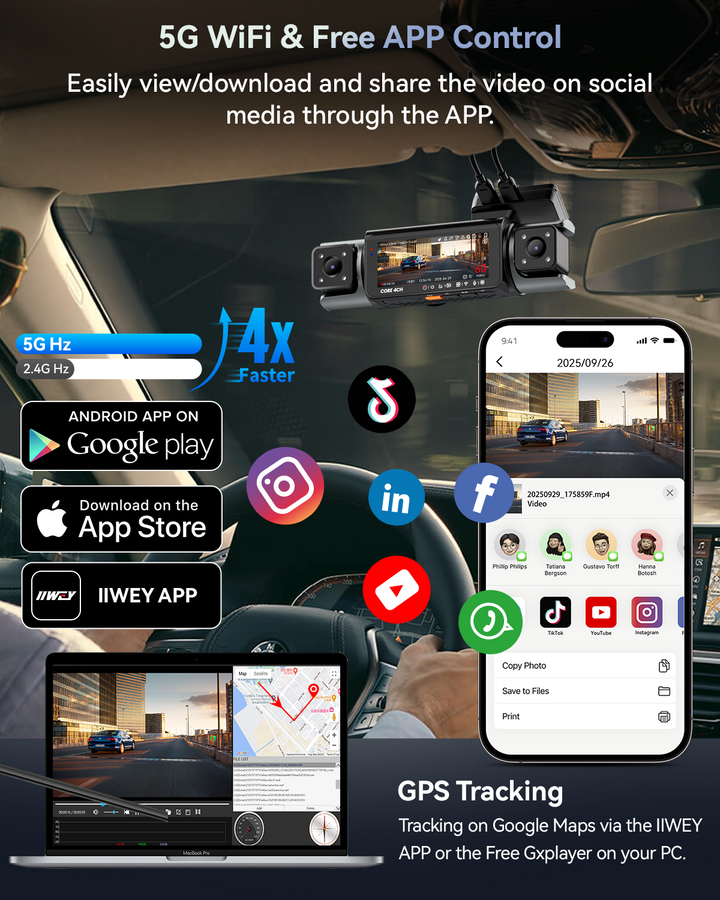 - ⭐【5G WiFi, GPS & OTA Upgrade】 The C4 PRO supports ultra-fast 5GHz WiFi for quick video downloads and smooth real-time preview via the iiwey app. Built-in GPS logs route, speed, and location, providing vital evidence when needed. With OTA (Over-the-Air) updates, the dash cam automatically stays up to date—no computer required, ensuring peak performance at all times.