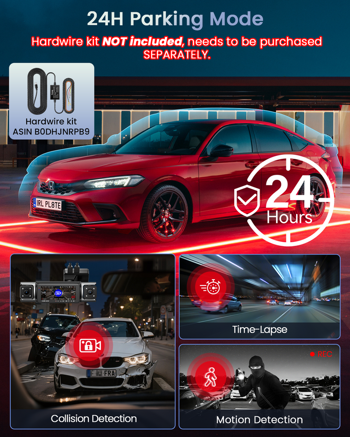- ⭐【3 Parking Modes for 24/7 Protection – 📢Hardwire Kit Required📢】 The C4 PRO offers three parking modes for all-day security: ✅ Collision Detection records when impact is detected; ✅ Motion Detection starts when movement is sensed; ✅ Time-Lapse continuously records at 1/10/15fps to save space while parked. ❗❗❗A hardwire kit (sold separately, ASIN: B0DHJNRPB9) is required to enable parking mode, and it's not included❗❗❗.