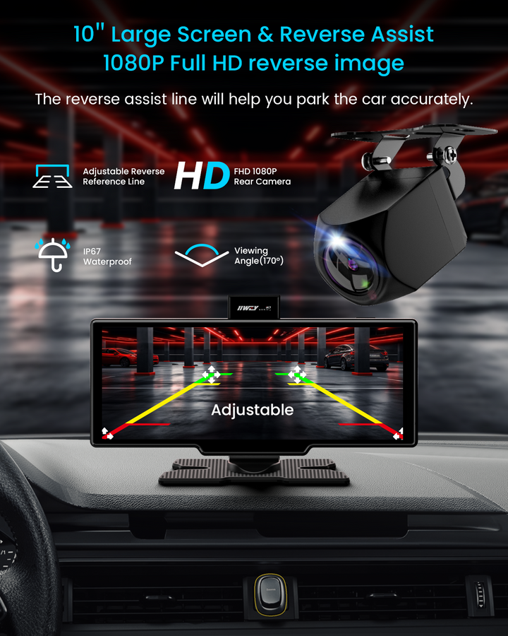 - 【4K Advanced Dashcam with Seamless Wifi Connectivity】IIWEY iK7 car stereo prioritizes safety and convenience with an integrated 4K dashcam. Capture high-resolution footage of the road ahead and your surroundings with the front and rear cameras. The wireless portable CarPlay screen allows for easy Wi-Fi connectivity, enabling instant downloading and sharing of footage to your smartphone. The included 64GB memory card provides ample storage for all your driving memories.